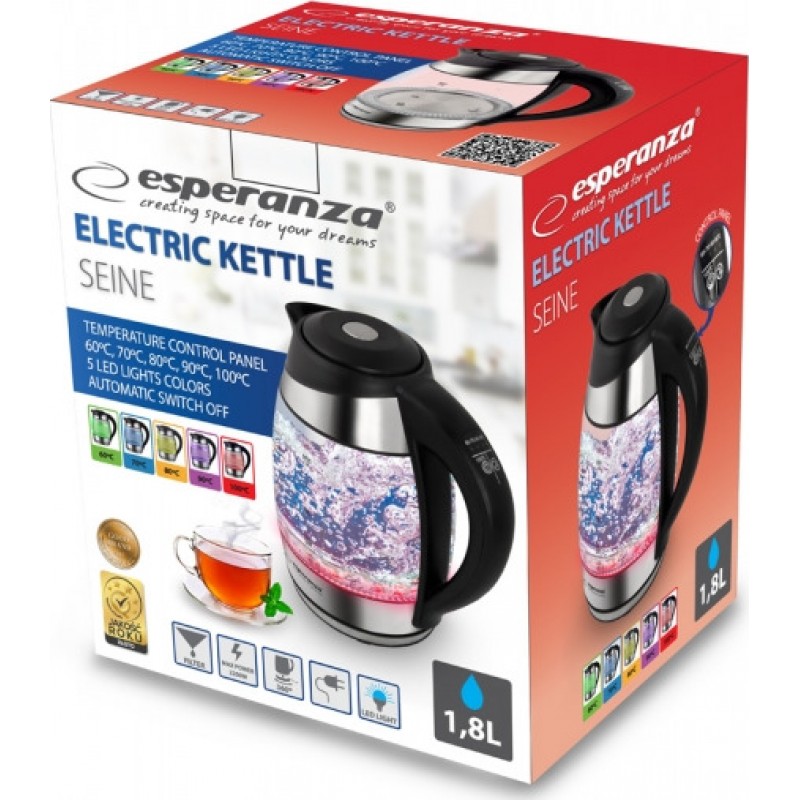 Ο ηλεκτρικός βραστήρας διαθέτει δυνατή ισχύ 2200 W, κανάτα από πυρίμαχο γυαλί χωρητικότητας 1.7 Lt, δείκτη στάθμης νερού με πολύχρωμο φωτισμό LED κατά τη διάρκεια βρασμού.